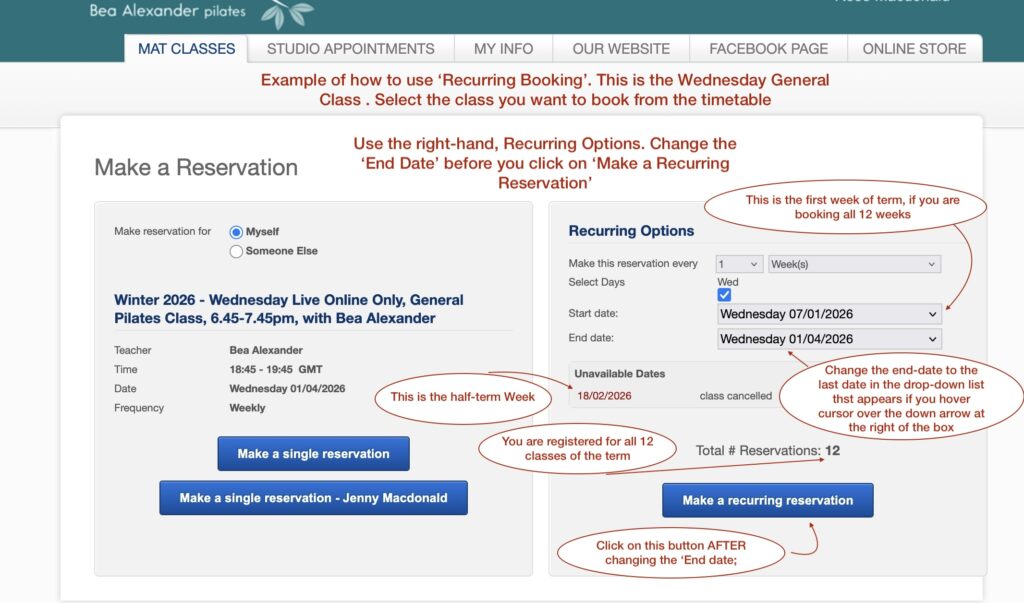 📍 IMPORTANT: If you want to attend all twelve classes, please fill in the ‘Recurring Reservation‘ information, leaving the ‘start date’ as the 8th January, and change the ‘end date’ to the last date in the drop down list that appears if you hover over it which will be the 2nd April. This will book your name in to the register for all twelve classes. This secures your place in each class and also means you will then be able to use the cancellation and re-booking facility during the term,